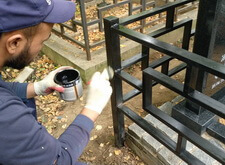 Снимаем с памятника защитные наклейки, красим ограждение, наполняем цветник корой.